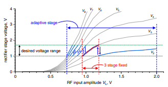 smaller, and so does the amplitudes of the received RF signal. More importantly, a meticulous effort is required when multiple implants are placed on the brain under a transmitter, as each implant has a different spatial position from the transmitter coil. In addition, RF power may fluctuate over time. These factors, both effects the coupling coefficient. In this case, rectifiers with a fixed number of stages are limited to a rather narrow operational voltage range, and cannot accommodate such variations. To address this, the authors propose an adaptive-stage rectifier that changes the number of connected stages by monitoring the final rectifier output voltage using two comparators and a digital block. By doing so, it can generate an output voltage within the targeted voltage range for a much wider RF input voltage range. The authors’ design and simulations in 180-nm CMOS SOI process show that the proposed rectifier is capable of keeping the output voltage within 1–1.7 V for an RF input range from 0.73 to 2 V, which is five times wider than that of conventional rectifiers with three fixed stages.